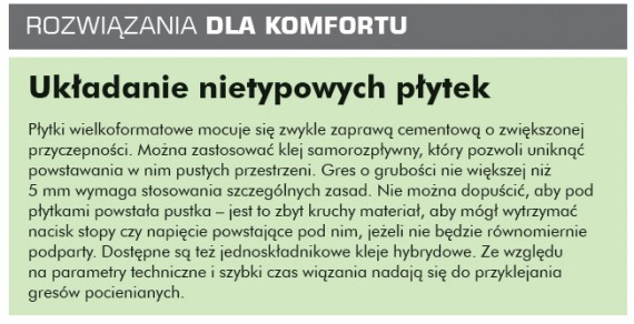 Podłoga w nowej funkcji. Coraz częściej podłoga pełni także funkcje grzejne. Montuje się w niej ogrzewanie, oszczędzając w ten sposób przestrzeń domu zajmowaną do tej pory przez grzejniki, a także chroniąc nasze zdrowie – kurz nie unosi się w powietrzu, tylko osiada na posadzce. Dzięki nowym materiałom posadzkowym, np. cienkim gresom, wzrasta też skuteczność ogrzewania podłogowego. W domach energooszczędnych i pasywnych posadzki z materiałów akumulujących ciepło takich jak ceramika czy kamień są dodatkowym źródłem energii.
