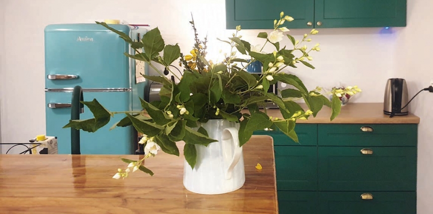 Często podczas remontu kuchni mamy pokusę dokonania w niej całkowitej rewolucji. Tymczasem zmian może wymagać tylko funkcjonalność i design zabudowy, a nie sam układ szafek oraz sprzętów. W tym przypadku kuchenny aneks oddzielony był od salonu murkiem, którego zadaniem było między innymi ukrycie ciągu roboczego. W murku były również instalacje wodno-kanalizacyjne. Szafki do przechowywania produktów i naczyń oraz lodówka umieszczone były na przeciwległej ścianie. Po długich debatach właściciele postanowili kupić całkowicie nowe wyposażenie, ale zostawić ten sam układ zabudowy. Pozostawienie murku pozwoliło uniknąć kosztownych zmian, związanych z przenoszeniem instalacji. Planując nową zabudowę, zrezygnowali jednak z szafek narożnych, kierując się przekonaniem, że proste ciągi zabudowy znacznie ułatwiają korzystanie z mebli. Dzięki precyzyjnemu rozplanowaniu wnętrz szafek poprawiła się także funkcjonalność kuchni. Dolne szafki zamykane drzwiczkami zastąpiono szufladami, które ułatwiają dostęp do produktów i naczyń. Liczbę szafek ograniczono do minimum – tutaj musi się zmieścić jedynie to, co niezbędne podczas kucharzenia na letnisku. Odzyskaną przestrzeń wykorzystano za to na większą lodówkę oraz zmywarkę. Dodatkowe miejsce do przechowywania i pracy zapewniają stoliki pomocnicze – barki na kółkach – jeden stanął między zabudową a lodówką, drugi pod oknem przy wejściu do aneksu. Spojrzenie na kuchnię z perspektywy saloniku przyciąga uwagę efektowną szmaragdową zabudową i turkusową lodówką w stylu retro. Będąc w środku aneksu, widzimy nowoczesną przestrzeń roboczą, a pracując przy niej mamy perspektywę na atrakcyjny pokój dzienny oraz zieleń ogrodu za jego oknami. Dawne położenie zabudowy nabrało nowego wymiaru. W takiej kuchni aż chce się gotować!